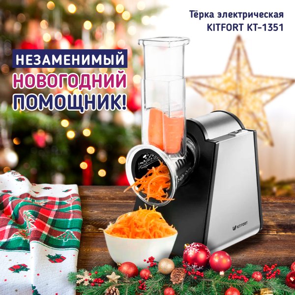 Как быстро приготовить целую кучу салатов? Вам поможет электрическая тёрка Kitfort КТ-1351! Она супер-удобная, супер-безопасная и исключает возможность микротравм, благодаря своему удобному принципу работы и супер-простому управлению одной кнопкой! Все продукты измельчаются автоматически, при этом контакт ножей терки с вашими руками исключен. Терка натрет и нашинкует овощи, фрукты и другие продукты: в комплекте есть 3 терочных ножа и 1 шинковочный нож.