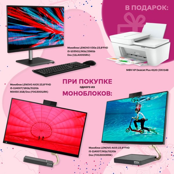 б оперативной памяти Яркий дисплей Full HD, 23,8» Быстрый доступ и хранение данных на 512 Гб, SSD 3⃣ Моноблок LENOVO V30a 23,8'FHD/i5—1035G1/8Gb/256Gb/Dos (11LA0055RU) Высокая производительность, благодаря i5-процессору и 8 Гб оперативной памяти Классный дисплей Full HD, 23,8» Практичное хранение на 256 Гб SSD При покупке любого из этих моноблоков, ты получаешь в подарок МФУ HP DeskJet Plus 4120! HP DeskJet Plus 4120 – это практичное и функциональное устройство, которое поможет вам справляться с различными задачами связанными с печатью, сканированием и копированием. МФУ поддерживает беспроводное подключение, что позволяет печатать и сканировать напрямую со смартфона или планшета. Количество подарков ограничено. Успей сделать правильный выбор для эффективной работы.