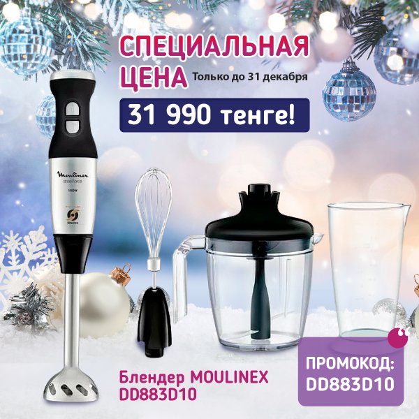 й ручке с нескользящим покрытием, а съемные части устройства можно мыть в посудомоечной машине. В комплект входят мерный стаканчик объемом 800 мл, измельчитель объемом 500 мл для легкой и удобной нарезки различных ингредиентов, а также венчик для блендера. Промокод DD883D10 — и спеццена 31990 тенге!