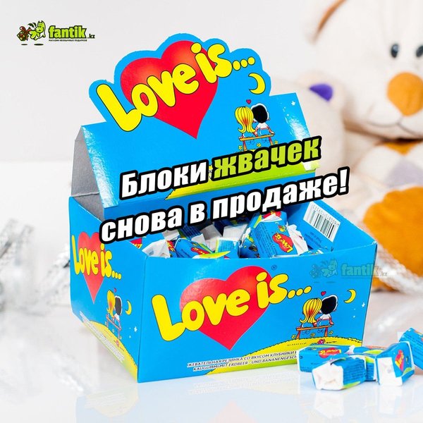 Дорогие друзья Хотели сообщить Вам о поступлении больших блоков жвачек Love is. В пачке 100шт «Love is…» сегодня не просто жевательная резинка, а культурное явление, знаковый продукт 90-х годов. Одна подушечка «Love is…» способна перенести вас в мир детства, а история на вкладыше — подарить отличное настроение! В наличии Упаковки со всеми 5-ю вкусами: — банан-клубника; — апельсин-ананас; — вишня-лимон; — яблоко-лимон; — кокос-ананас. Цена — 2600 тенге