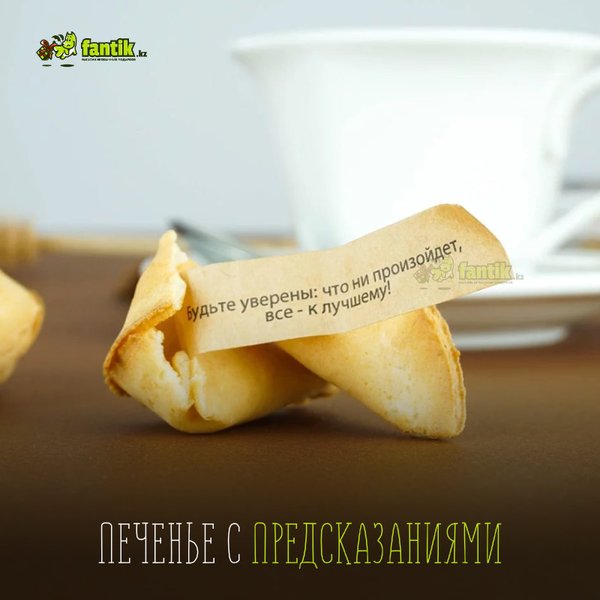 Ура! Замечательные печенья с предсказаниями снова в продаже Теперь удивить Ваших близких стало ещё легче — подарите им эти сладкие и нежные вкусняшки с приятными посланиями внутри. Порадуйте близких уже сегодня! Предсказания на русском языке. Также есть в наборах из 6-ти и 12-ти печений Цена одной печеньки — 120 тенге Набор из 6-ти шт — 1000 тенге Набор из 12-ти шт — 1700 тенге