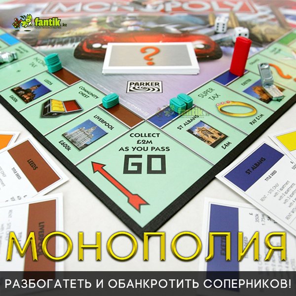ется самым гибким, пластичным, тот и победит в игре. Цена — 3700 тенге 3. Как угадать кто я? Каждый игрок надевает на голову обруч и устанавливает на него карточку с рисунком, который известен остальным игрокам, но не Вам. Вы в это время пытаетесь угадать слово на выпавшей Вам карточке, задавая вопросы о себе другим участникам игры с помощью вспомогательных карточек. Соперники лишь могут отвечать на вопросы только словами «да» или «нет». Цена — 3500 тенге 4. Монополия А также всем известная игра, в которой Вы можете покупать, арендовать и продавать свою собственность! В самом начале игры участники выкупают недвижимость, перемещаясь по карте. Игроки, которые имеют свою недвижимость, взимают арендную плату с игроков, которые попадают на их купленный участок. При строительстве домов и гостиниц арендная плата значительно возрастает, поэтому участникам следует вести строительство на как можно большем количестве участков. Цена — 5200 тенге