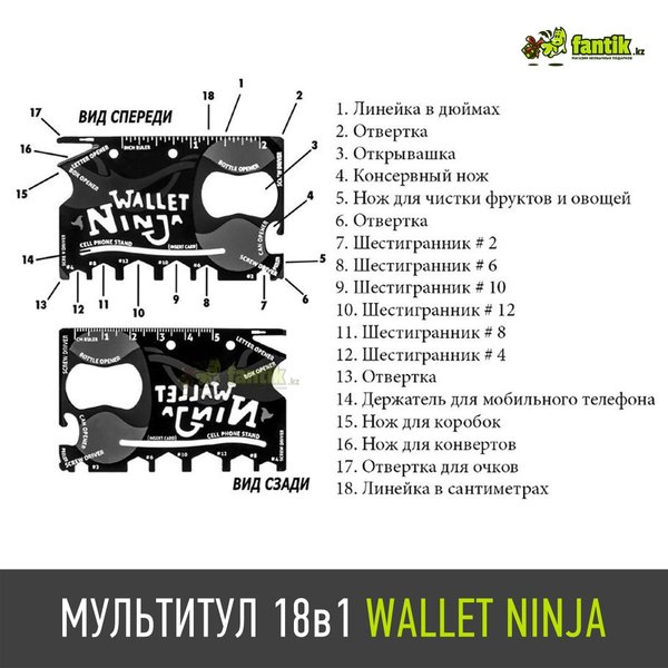 Обозначения всех 18-ти мини-инструментов мультитула Wallet Ninja в компактном исполнении, которые можно всегда носить с собой! Материал: закалённая нержавеющая сталь В наличии. Цена со скидкой — 1200 тенге