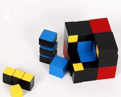 ый результат будет совпадать с расположением членов в алгебраической формуле. Например такой: а3 + За2Ь + ЗаЬ2 + Ь3, (а + b + с)2. Для успешной сборки ребенку нужно включить логическое мышление: то есть прикладывать друг к другу грани одного цвета: красные к красным, синие к синим и т.д. Причем складываемые в одно целое призмы и кубики должны также совпадать по размеру. триноминальный куб в разобранном виде