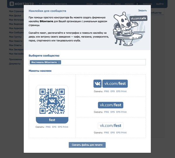 Команда ВКонтакте (03.06.2015): Множество городских мест и заведений кафе, магазинов, университетов, парков, спортивных и танцевальных клубов присутствует ВКонтакте и взаимодействует здесь со своей аудиторией. Для того чтобы посетители могли узнать о сообществе, мы создали этот конструктор простой и быстрый способ сделать фирменную наклейку ВКонтакте с уникальным адресом страницы. Конструктор будет доступен в настройках сообщества под адресом страницы и по прямой ссылке