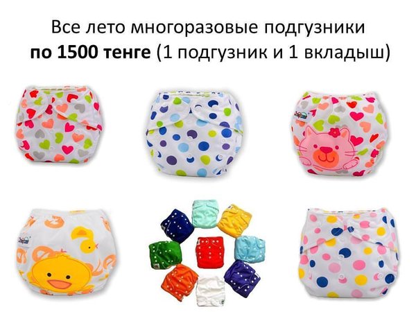 Многоразовые подгузники от 0 до 13 кг. На кнопке. 1500 тенге. Акция лета. В ассортименте самые клевые расцветки. 1 подгузник и 1 вкладыш