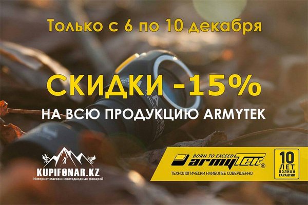 Итак, всем, кто ждал скидок на фонари Armytek - вот они, не пропусти! Декабрьская распродажа на всю продукцию Armytek началась, только с 6 по 10 декабря успей купить фонари Armytek по самым лучшим ценам — со скидкой -15%. Подробности и все товары со скидкой смотрите на сайте. Фонари Armytek — одни из самых совершенных фонарей в мире, в которых используются самые передовые технологии, высококачественные материалы и электроника из США и Японии. Производитель — канадская компания, которая держит качество «на высоте»…