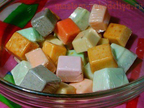 Нарезаем мылко на брусочки, у сердечек подрезаем торчащие «кудряшки» (или ровненько срезаем тонкий слой на «дне» — аккуратнее выглядеть будет)
