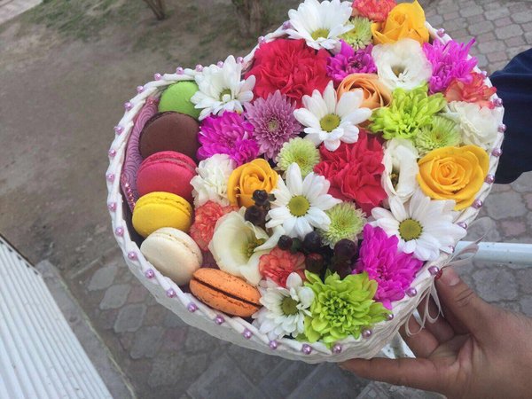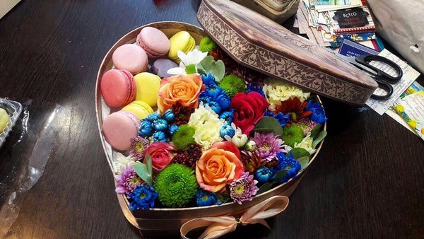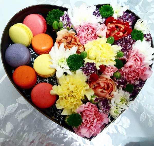 Ваша девушка большая сладкоежка? Коробочка с цветами и свежими макарунами станет идеальным подарком для нее