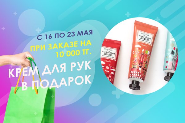 Уважаемые покупатели с 16 по 23 мая у нас действует акция, при заказе на сумму от 10 000 тг. в подарок один крем для рук бренда Eunyul. Выбор крема осуществляется менеджером. Акция действует на все регионы Республики Казахстан. Всю информация по кремам вы можете найти на сайте или пройти по этой ссылке Всем веселых покупок!