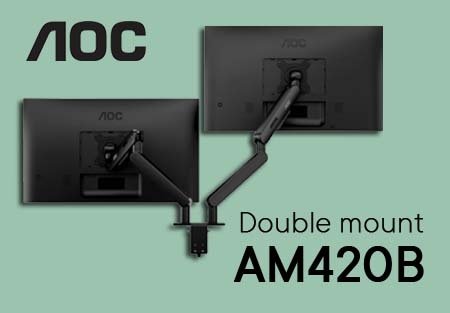 ониторов. Крепление к столу: возможны два варианта — C-зажим (Clamp) или через отверстие столешницы (Grommet mount / Bolt-through). Ключевые особенности и преимущества для ваших клиентов Универсальность и надежность. Крепление совместимо с мониторами и телевизорами диагональю от 17 до 34 дюймов и весом от 2 до 9 кг каждый (при использовании VESA 75×75 или 100×100 мм). Это покрывает большинство моделей на рынке — от компактных офисных до широких изогнутых мониторов. Эргономика и здоровье. Регулировка по высоте, наклону (±90°), повороту (±180°) и возможность изменения угла обзора каждого монитора (±90°) позволяют пользователю создать идеальное положение экранов, снижая нагрузку на шею и глаза. Это сильный аргумент для корпоративных закупок, ориентированных на заботу о сотрудниках. Освобождение пространства. Убрав массивные подставки, клиент получает назад до 40% полезной площади стола. Освободившееся место можно использовать для документов, телефона, канцелярии или просто для создания ощущения порядка. Аккуратный вид и организация проводов. Встроенный канал для кабельного менеджмента позволяет скрыть провода питания и видео, что делает рабочее место не только функциональным, но и эстетичным. Прочный и безопасный монтаж. Прочная стальная конструкция и надежное настольное крепление (C-образный зажим + альтернативный вариант сквозного отверстия) гарантируют устойчивость даже для тяжелых конфигураций. AOC AM420B — выгодное пополнение вашего ассортимента Трендовый продукт. Рынок решений для организации рабочего пространства и эргономики стабильно растет. Широкая целевая аудитория: от малого бизнеса и коворкингов до крупных офисов и частных пользователей. Повышение среднего чека. Крепление — идеальный сопутствующий товар при продаже мониторов или готовых рабочих станций. Узнаваемый бренд. AOC — это гарантия качества и надежности, который не требует дополнительного представления на рынке мониторов и аксессуаров. Конкурентное преимущество. Наличие такого функционального крепления на складе выделит ваше предложение среди конкурентов. AOC AM420B — привлекательный товар: востребован как среди офисов и корпоративных клиентов, так и среди домашних пользователей, геймеров и фрилансеров. Он универсален, надёжен, лёгок в установке и подходит для широкого спектра задач. Кроме того, современный стильный дизайн и функциональность делают его конкурентным на рынке креплений и аксессуаров для рабочих мест. Это отличное дополнение к ассортименту оргтехники, которое расширяет предложение для клиентов, ищущих не просто мониторы, но и комфортную, эргономичную рабочую среду.