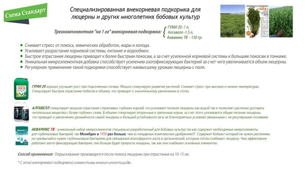 наивысшему урожаю люцерны с поля. Способ применения внекорневой подкормки: Опрыскивание производится после покоса люцерны при отрастании на 10—15 см.