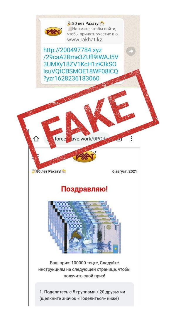 зыгрыш денежных средств от компании АО «Лотте-Рахат». Настоящим информируем вас о том, что АО «Лотте-Рахат» не имеет никакого отношения к происходящему. Просим вас ни в коем случае не открывать подобные ссылки, так как за происходящим стоят мошенники, которые воруют ваши личные данные. Будьте бдительны!