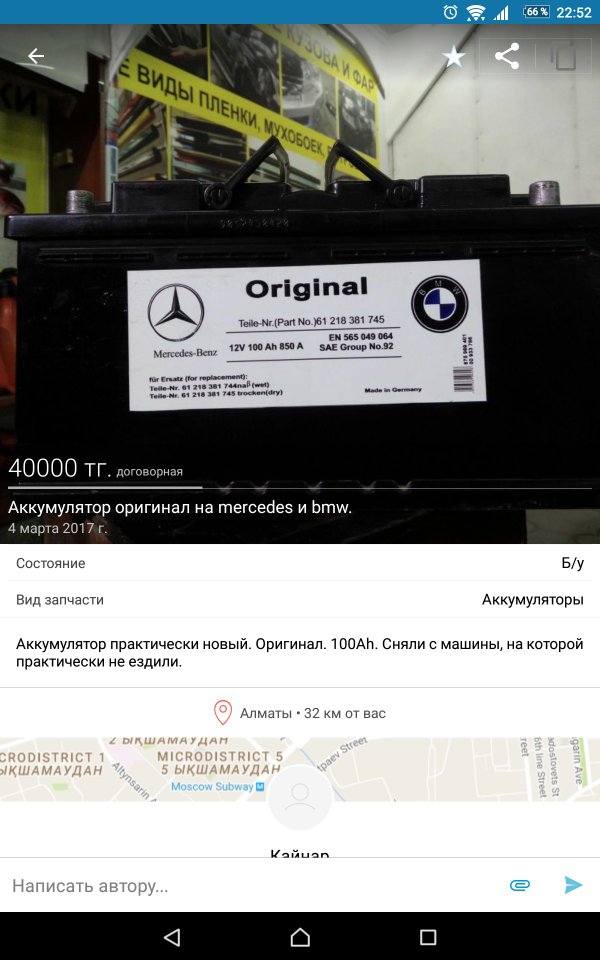 Пуск! 08.03.17 На olx.kz обнаружил вопиющую ложЬ, которая взбудоражила меня своей наглостЬю. А именно, объявление о продаже аккумулятора, якобы оригиналЬного от BMW и Mercedes. К публикации прилагаю фото, на которых не вооруженным глазом видно, что этот аккумулятор производства ТОО «Кайнар», что находится в Талдыкургане. Цена данного аккумулятора от 18 000 до 20 000 тг. А также, логично предположитЬ, что никакой производителЬ не станет печататЬ болЬшими буквами слово ”Original”. И в конце концов, BMW и Mercedes это абсолютно разные компании по… — Читать дальше