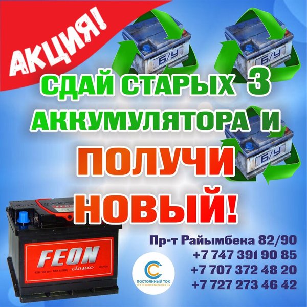 Акция! Принеси три старых Аккумулятора и получи аналогичный новый. Любая ёмкость, любой размер.