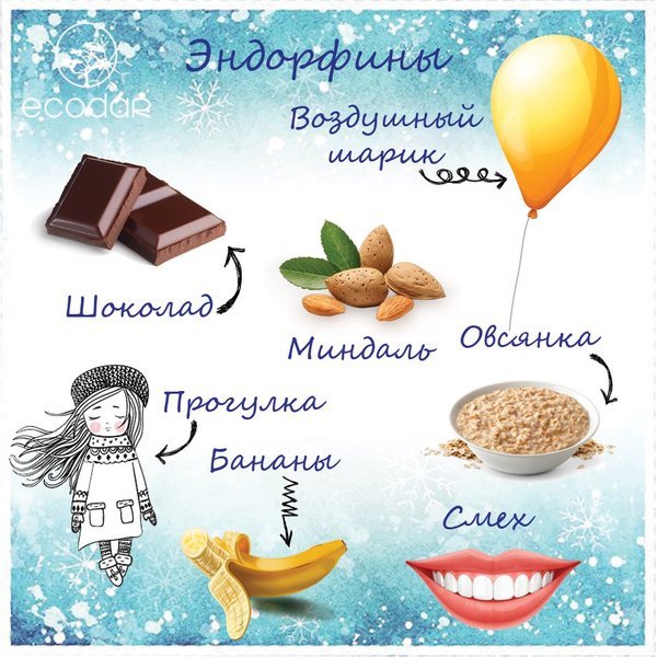 Иногда холодные деньки совершенно замораживают нас и ничего не радует. Можно перечитать кучу книг по психологии в поисках состояния радости, а можно воспользоваться скорой помощью и быстро получить гормоны счастья: 1. Шоколад лучшее, что может поднять настроение. Один маленький кусочек и вы станете радостнее и получите мощный заряд эндорфинов. 2. Воздушный шарик разве можно быть грустным, когда у тебя в руках воздушный шарик. 3. Миндаль природный антидепрессант помогает справиться со стрессом и поднимает настроение. 4. Бананы вкусный эндорфин,… — Читать дальше
