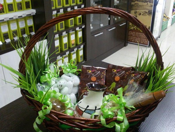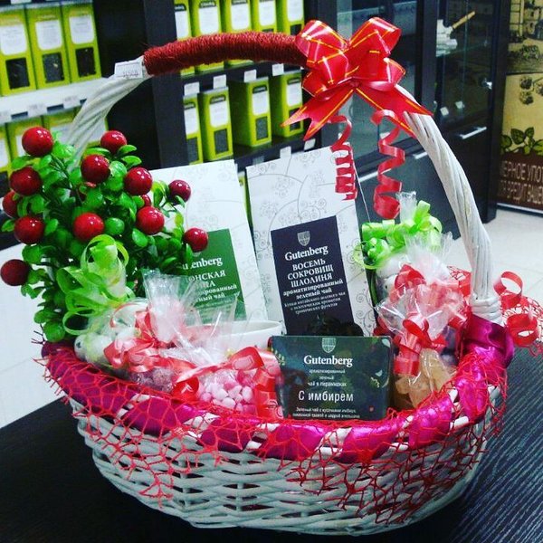 Чайная Подарочная корзина включает в себя несколько 100-граммовых фирменных упаковок вкусного чая, кружку, чай в пирамидках, связанный чай, немецкие сладости в ассортименте, а так же сахар! Цена: 16.500 тг.