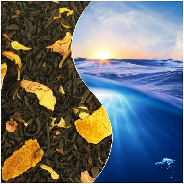 Океанское Солнце — неповторимая смесь цейлонских и индийских чаев с добавлением цедры апельсина, лепестков розы, сафлора и подсолнечника, а так же пряным ореховым ароматом.