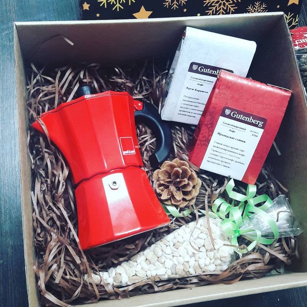 Новогодний подарок для любимой: гейзерная кофеварка, 2 сорта ароматнейшего кофе и упаковка сахара. Для вкусного утра! Цена: 8600 тг.