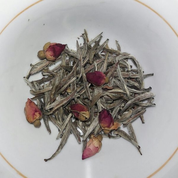 Белый чай высочайшего сорта Байхао в сочетании с нежной китайской розой — в сухом состоянии, в заваренном виде и сам настой. Идеальное сочетание для теплого августовского вечера.