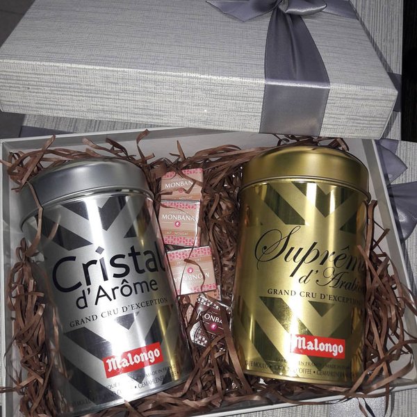 Кофейный подарок для истинных ценителей. Две банки молотого кофе — Эспрессо и Супремо Арабика, а так же изысканый шоколад ручной работы Монбана.