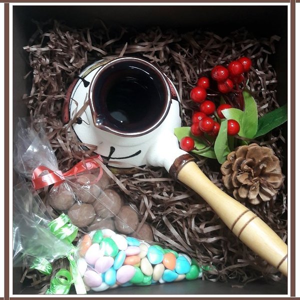 Подарочный набор: керамическая турка, шоколадные сердечки и вишня в шоколаде — в нарядной коробке.