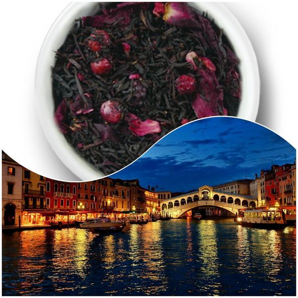 Чай «Венецианская ночь» никого не оставит равнодушным. Он представляет собой купаж китайского красного чая Кимун и высокогорного Цейлона, в сочетании с ягодами ежевики и красной смородины, кусочками клубники и лепестками красной розы. Аромат просто божественный, а при заварке — смягчается и становится нежным. Во вкусе кислинка и чуть уловимая сладость. В послевкусие приятная ягодная нотка. Чай прекрасен как для утреннего пробуждения, так и для вечерних посиделок в кругу семьи или друзей.