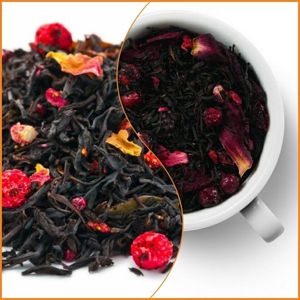 Чай «Венецианская ночь» — изысканный купаж цейлонского и Кимун чая с каркаде, натуральными ягодами ежевики и красной смородины, лепестками пиона, кусочками малины и клубники.