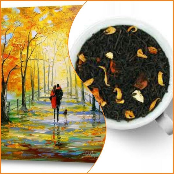 Черный чай «Золотая осень» — теплый купаж индийского и цейлонского чая, с добавлением цедры, лепестков апельсина и кусочков яблока.