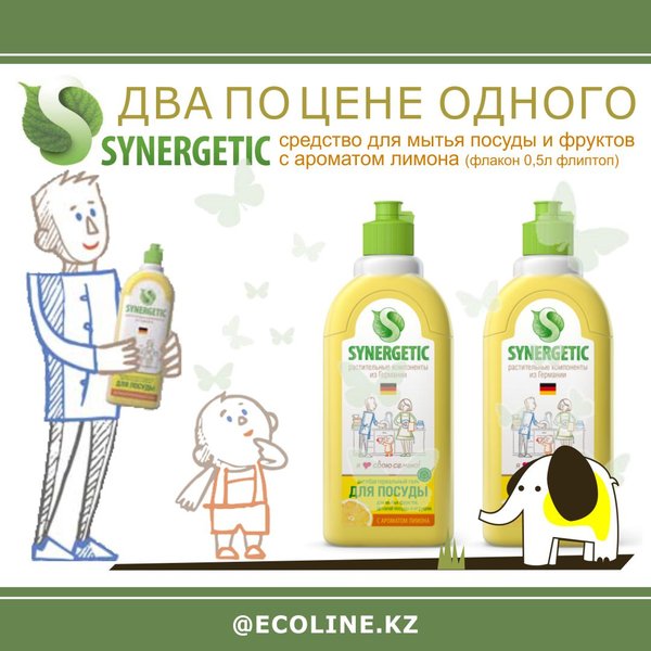АКЦИЯ!!! СКИДКИ!! Дорогие друзья! Спешим Вас обрадовать новой акцией «ДВА ПО ЦЕНЕ ОДНОГО!» ЭКО — средство для мытья посуды и фруктов с ароматом лимона от компании Synergetic! Благодаря органическому составу Эко — средства для дома Synergetic НЕ ВЫЗЫВАЮТ АЛЛЕРГИЮ и являются безопасными для здоровья детей, взрослых и домашних животных. Только в наших магазинах, приобретая одно средство для мытья посуды с ароматом лимона, вы получаете второе в подарок! Ждем Вас: - ул.Манаса, 19, угол Абая,. - ул. Кабанбай Батыра, 122, угол Желтоксан,