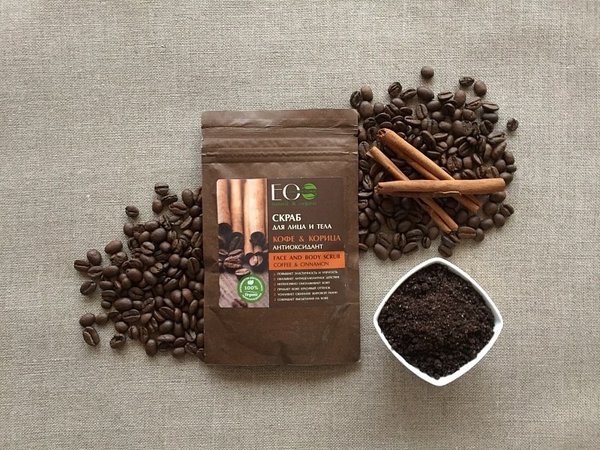 натурального бронзатора), устраняет тусклость, повышает тургор. Кофейный скраб от EO Laboratorie может заменить несколько косметических средств. Он содержит ценные масла, обогащен морской солью, тростниковым сахаром, главное, изготовлен на основе высококачественного натурального кофе. Сладкое и пряное сочетание натурального кофе и корицы подарит роскошный уход коже. Скраб активно тонизирует и ревитализирует клетки кожи, повышает ее защитные функции, оказывает выраженное антицеллюлитное действие. Комплекс активных компонентов оказывает антибактериальное действие, благодаря чему кожа глубоко очищается. Скраб «Кофе & Корица» воодушевляет Вас и совершенствует кожу!