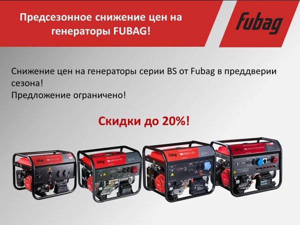 Уважаемые друзья, В преддверии сезона мы решили снизить цены на генераторы серии BS от компании Fubag! Если вы задумывались о покупке генератора, то сейчас лучший момент! Скидки до 20%! Предложение ограничено! Со всем ассортиментом Fubag Вы можете ознакомиться на сайте компании Ламэд.