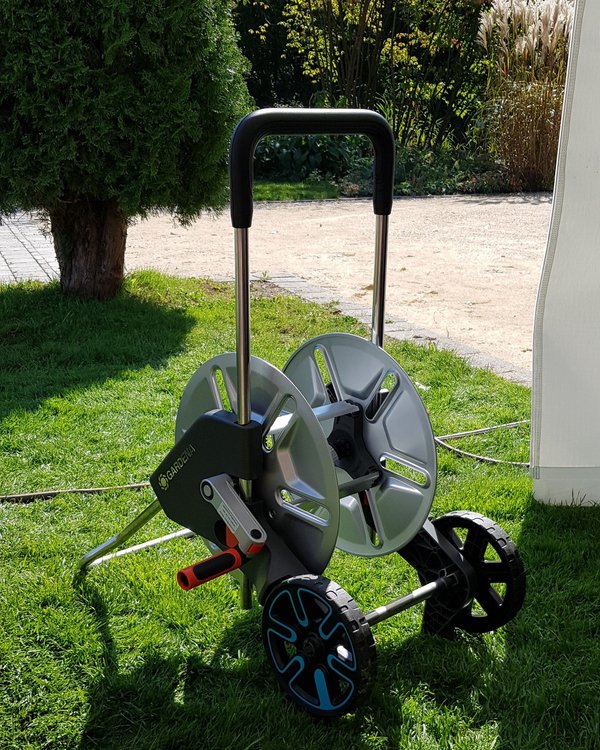 сть и безопасность в применении. Дополнительный комфорт во время перемещения тележки по участку создают большие маневренные колеса и эргономичная рукоятка. Аккуратное хранение и транспортировку шланга обеспечивает специальная катушка Gardena Classic. С ней садовый шланг не займет много места в чулане или багажнике авто. А если Вы воспользуетесь настенным крепежным элементом (держатель для шланга), то сможете надежно разместить катушку со шлангом на стенках хозяйственной постройки.