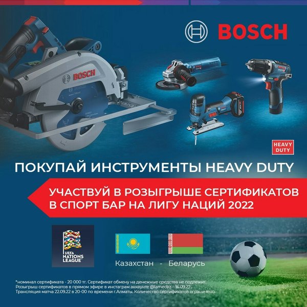 Покупай инструменты BOSCH HEAVY DUTY и участвуй в розыгрыше сертификатов в Спорт Бар на Лигу Наций 2022 Правила проведения акции: Период проведения акции – с 15 августа 2022 г. по 15 сентября 2022 г.Покупатели продукции Heavy Duty от Bosch участвуют в розыгрыше сертификатов в Cпортбар (The Albion club, микрорайон Самал-2, 104, Алматы) на просмотр матча Лиги Наций 2022 Казахстан – Беларусь. Номинал сертификата 20 000 тг. (сертификат может быть использован только на этом мероприятии). Для регистрации в акции необходимо подписаться на инстаграмы к… — Читать дальше