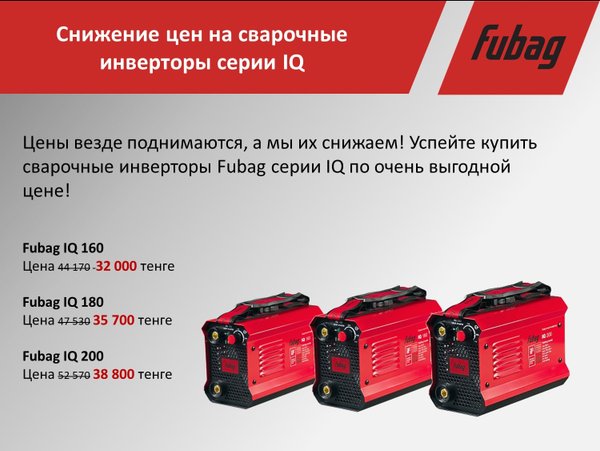 Друзья, Каждый день мы видим, что цены на все виды товаров постоянно растут вверх. А мы, в свою очередь, решили снизить цены на популярные сварочные инверторы серии IQ! Данные аппараты будут отличным помощником в решении бытовых задач и порадуют вас выгодной ценой! Со всем ассортиментом Fubag Вы можете ознакомиться на сайте компании Ламэд.