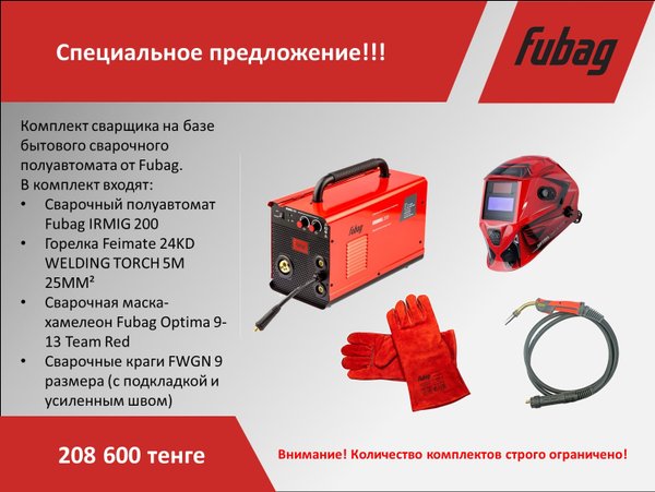Уважаемые друзья, Мы решили создать комплект сварщика на базе бытового полуавтомата Fubag IRMIG 200. В комплект мы включили горелку, маску и краги. И все это по цене IRMIG с заводской горелкой. Очень выгодное предложение! Торопитесь, комплектов совсем немного! Со всем ассортиментом Fubag вы можете ознакомиться на сайте компании Ламэд.