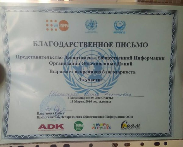 Ариэль Малышова (20.06.2016): Получили Благодарственное письмо от Представительства Департамента Общественной информации Организации Объединенных наций за участие в «Международном дне счастья»))) Очень приятно, будем и впредь принимать участие в общественных началах.