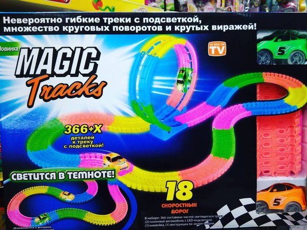 Ариэль Малышова (26.11.2017): Magic Tracks — Набор сборно-разборной трассы для светящейся машинки Форма трассы может быть и прямой и изогнутой, поэтому трасса может иметь практически любую форму. Даже «мертвую петлю» В наличии трассы длиной 5 и 3 метра.
