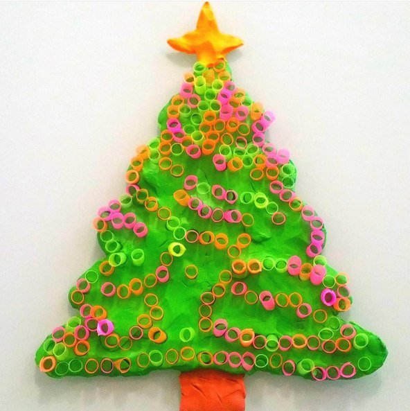 Поделки и игры для детей (14.11.2016): НОВОГОДНИЕ ПОДЕЛКИ. Поделка к Новому году для малышей. Аппликация «Новогодняя елочка», выполненная из пластилина (или теста для лепки) и пластиковых трубочек, разрезанных ножницами на кусочки.