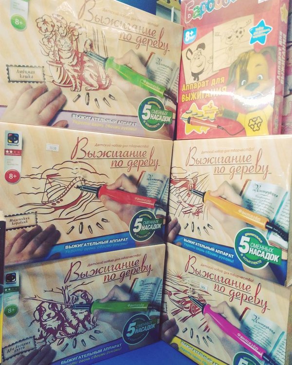 Ариэль Малышова (18.12.2016): Помните в нашем детстве, каждый мальчик хоть раз держал в руках выжигатель по дереву, и со старанием старался выжечь что-нибудь красивое на деревянном полотне? Так вот сейчас компания Фантазер представила наборы выжигания с нанесенным контуром изображения для простоты выжигания. А 5 сменных насадок помогут более красиво и точно повторить контур деталей картины.