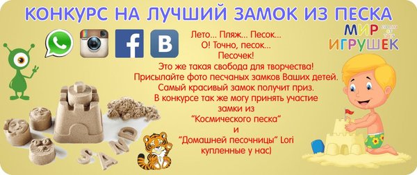 Внимание! У нас новый конкурс) Условия: 1. Участвуют детки из г. Алматы 2. Необходимо слепить из песка замок или дворец и сфотографировать. 3. Фотографию выложить в нашей группе в Альбом «Конкурс „Замок из песка»“ с указанием возраста, имени и фамилии вашего малыша Обязательно: 1. Необходимо быть подписчиком нашей группы Мир игрушек. 2. Необходимо рассказать друзьям об этом конкурсе (сделать репост). 3. Срок конкурса до 13 августа 2016 г. 4. Победители конкурса будут определены путем голосования жюри (работников магазин Мир игрушек). 5. Результ… — Читать дальше