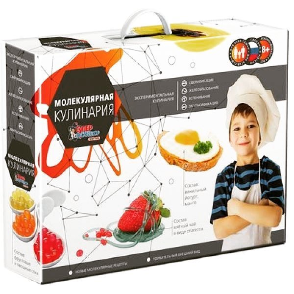 т натрия 20 г. Лактат кальция 50 г. Хлорид кальция 50 г. Соевый лецитин 30 г. Пищевые красители 2 шт. Мерные сферические ложки (5, 10 и 25 мг.) 3 шт. Декоративные ложки для сервировки 3 шт. Деревянные палочки для размешивания 3 шт. Пакетики для изготовления льда 2—3 шт. Пластиковый шприц 2 шт. Мерный стакан 1 шт. Ёмкости для растворов 3 шт. Силиконовая трубочка 1 шт. Наклейки с номерами (1,2,3) 3 шт. Карточки с рецептами 5 шт.