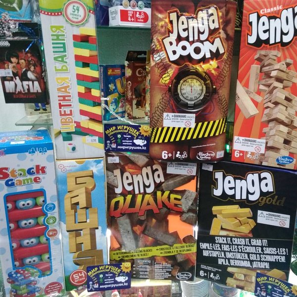Ариэль Малышова (22.12.2016): Дженга — башня — знаменитая игра на ловкость и аккуратность. Классическая, Boom, Quake, Gold. Аналог из России Башня классическая и цветная. А так же китайский аналог со смайликами) На любой вкус для увлекательной игры. Самый широкий ассортимент игр в Мире Игрушек. @ Мир Игрушек Алматы