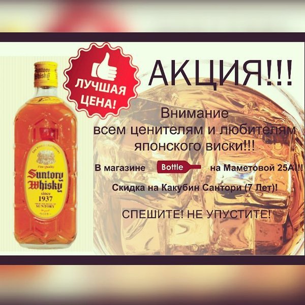 Акция в на #японскийвиски Японский виски Suntory Kakubin впервые появился на алкогольном рынке в 1937 году. С тех пор он пользуется большой популярностью не только в Японии, но и за ее пределами. Напиток разливается в граненые бутылки необычной формы, которая напоминает панцирь черепахи. Виски Suntory Kakubin обладает янтарным цветом, приятным ароматом и очень мягким, освежающим вкусом. Виски Suntory Kakubin идеален для домашнего употребления. Он хорош как в чистом виде, так и в качестве основы для разных коктейлей.