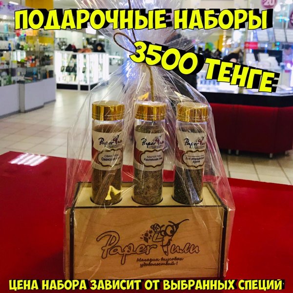 Подарочные наборы ⠀ ⠀ Соберём любой набор специй/смесей по вашему желанию!!!!⠀ ⠀ • Инстаграм Paperчили • Сайт ⠀ Цена наборов зависит от выбранных специй, размера колбочки,и подставки. ⠀ ⠀ Цена Колбы (пустой):⠀ ———————————⠀ 30 мл-200 тенге ⠀ 50 мл-250 тенге⠀ 90 мл-300 Тенге ⠀ ⠀ Цены подставок от 800 до 2300 тенге. ⠀ ⠀⠀ При заказа на 5000 доставка по Алмате БЕСПЛАТНО!!!!⠀⠀ ⠀⠀ Ждём всех в гости ⠀⠀ ⠀⠀ г.Алматы,Тимирязева, 42, ТРК «ГАЛЕРЕЯ» 1 этаж, островок PaperЧили ⠀⠀⠀⠀ ⏰Работаем ежедневно с 10:00 до 21:00