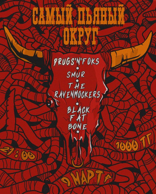 Almaty Classic Rock&Metal Community (06.03.2019): Выступление молодых групп: —- Black Fat Bone —- The Ravenmockers —- Drugs'n'foks —- SMUR —- 9 марта, 21:00, бар «Самый пьяный округ» (улица Калдаякова, 17, Алма-Ата), вход — 1000тг.