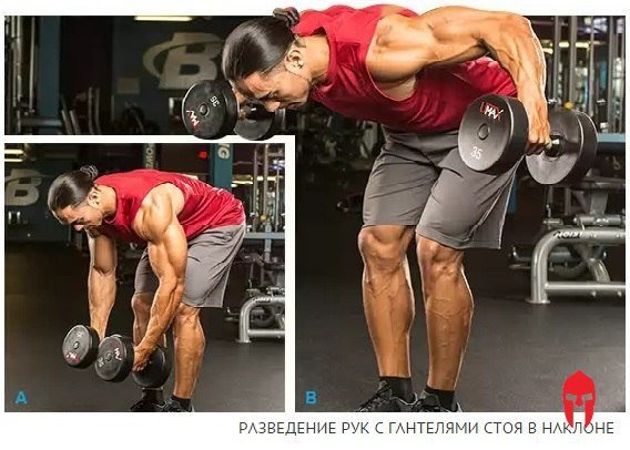 ажерам, которые нужны вам здесь и сейчас. Когда в спортзале полно народа и все тренажеры заняты желающими потренироваться, очень важно уметь находить окольные пути и знать, чем заменить то или иное упражнение. Если около снаряда для ключевого упражнения вашего комплекса выстроилась длинная очередь, вы можете выбрать вариант Б или даже перейти к вариантам В и Г. Хотя может показаться, что вынужденный простой около любимого тренажера путает ваши карты, на самом деле в нем сокрыты новые возможности. Знание многочисленных вариантов выполнения одного упражнения ключ к максимальному росту мускулатуры. Различные снаряды и приспособления подвергают мышцы тренировочному стрессу с уникальным направлением суммарного вектора нагрузки, а это генерирует новые стимулы для мышечного роста. Штанги, гантели, тренажеры, тросовые тяги и силовая машина Смита у каждого типа оборудования есть свои особенности и преимущества, и ни один из них не тренирует мышцы одним и тем же способом. В конечном счете, когда вы включаете в тренировки все виды оборудования, вы прорабатываете мышцы более полноценно и подвергаетесь меньшему риску столкнуться со злополучным плато в отдельно взятом упражнении. Превращаем задние дельты в камень В этой статье я устрою вам тур по упражнениям для задних дельт, и опишу семь вариантов выполнения разведения рук. Каждое из семи движений имеет свои особенности, и это значит, что в ваших тренировках всегда найдется место для некоторого разнообразия. Если вы оказались в тупике или достигли тренировочного плато, подобная вариативность может оказаться именно тем, чего вам так не хватает. Не думайте, что данный совет применим лишь к задним дельтовидным мышцам. По большому счету, для оптимизации мышечного роста вы должны знать несколько вариантов выполнения каждого упражнения и в определенный момент включать их в свои тренировки. Освоив эту нехитрую науку, вы станете не только самым быстрым бодибилдером в спортзале, но еще и самым большим! 1. Разведение рук с гантелями стоя в наклоне Это базовое движение со свободным весом выполняется стоя. Вы наклоняете корпус вперед в тазобедренных суставах, слегка сгибаете колени и изгибаете поясницу дугой. Такое положение туловища позволяет во время перемещения рабочего веса использовать импульсы, исходящие от коленей и бедер. Поднимайте гантели в стороны по максимально широкой дуге, сохраняя небольшой изгиб в локтевых суставах. 2. Разведение гантелей сидя в наклоне Движение во многом повторяет предыдущий вариант, но сидя жульничать намного труднее, так что это упражнение сложнее разведения рук стоя. Как правило, рабочий вес уменьшается, поскольку вы не можете генерировать дополнительный импульс от нижней части тела. 3. Разведение гантелей лежа на наклонной скамье лицом вниз Еще один вариант разведения рук на задние дельты, который снижает влияние инерционной составляющей. Вы лежите на скамье с небольшим наклоном и выполняете то же движение, что и раньше. Чтобы стабилизировать свое тело, хорошенько упритесь ногами в пол. В завершающей стадии подъема старайтесь прижимать грудную клетку к скамье, чтобы нивелировать виляние движущего импульса. 4. Подъем гантели одной рукой стоя в наклоне В этом варианте одна рука свободна, и я рекомендую вам держаться ее за скамью, чтобы стабилизиров