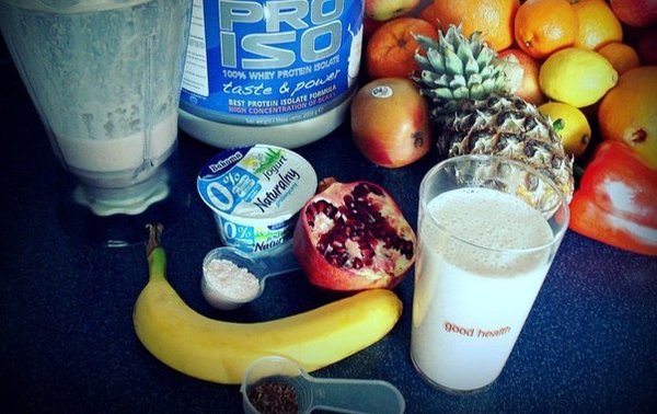 зачастую не хватает. К тому же, мясо долго усваивается, процесс его переваривания отнимает у организма много энергии. Плотный прием пищи едва располагает к незамедлительному походу в тренажерный зал. С другой стороны, есть разумная альтернатива мясным блюдам. Этой альтернативой является порошковый концентрат различных видов протеинов. При этом каждый вид решает определенную задачу: наращивание массы, восстановление мышц. Изначально концентрированный протеин не мог похвастаться своей удобоваримостью, он заставлял бодибилдеров морщиться, как от зубной боли. На сегодняшний момент ситуация более благоприятная, и рынок предлагает множество вкусных протеинов. И все же, частая процедура приема порошка, разведенного на воде, несет в себе мало приятного. Порошок не идет в сравнение с натуральным питанием. В данной статье вам предлагаются рецепты наиболее популярных протеиновых коктейлей из натуральных продуктов, которые можно приготовить в домашних условиях. Вначале поговорим о времени, наиболее благоприятном для употребления коктейлей, приготовленных в домашних условиях, с содержанием тех или иных продуктов. Утром Утром уровень гликогена в печени сокращается, поскольку ночью организм в течение длительного времени не получает пищу. В принципе, ничего страшного в этом нет, затраты энергии во сне минимальны. С другой стороны, активные действия после пробуждения вкупе с нехваткой гликогена могут спровоцировать секрецию катаболических гормонов, разъедающих мышцы. Чтобы обезопасить себя, можно выпить после пробуждения протеиновый коктейль. При этом обязательно добавить в протеин фруктозу, которой много во фруктах и особенно в меде. В отличие от глюкозы, которая попадает в мышцы тут же идет в расход, фруктоза направляется в печень, где превращается в гликоген. Перед тренировкой Прием пищи перед занятиями должен снабдить организм нутриентами, помогающими росту и мышц и снабжающими мускулатуру энергией. Следовательно, нужен как протеин (20 г), так и углеводы (40 г), желательно медленные. В этом случае обычные блюда не помогут. Во-первых, с набитым животом тяжело тренироваться, во-вторых, натуральная пища долго усваивается. В такой ситуации будет удобно прибегнуть к протеиновому коктейлю на сывороточном белке. Выбирая углеводы, следует, опять же, остановиться на фруктозе. Фруктоза медленно отдает энергию и не провоцирует секрецию инсулина, который в начале тренировки не нужен, так как понижает уровень сахара в крови и мешает сжиганию жира. После тренировки После тренировки перед вами стоит две задачи – дать мышцам побольше протеина и восстановить гликоген. Разумеется, с помощью протеинового коктейля, так как обычная пища не подходит из долгого усвоения. Как правило, рекомендуется сывороточный протеин (40 г), но недавно было выяснено, что этот протеин следует смешать с казеином, мышцы будут расти лучше. Также нужны быстрые углеводы, минимум 60 грамм (конфеты, сладкие булочки). Между приемами пищи Бодибилдеру нужно есть каждые 2—3 часа, что очень тяжело осуществить, если вы не в отпуске. Протеиновые коктейли решают и эту проблему, особенно если сделать настоящий коктейль с добавлением меда, фруктов. Таким образом, можно превратить тривиальную процедуру подпитки белком в настоящее удовольствие. Выходит вкусно и питательно. Основой зд