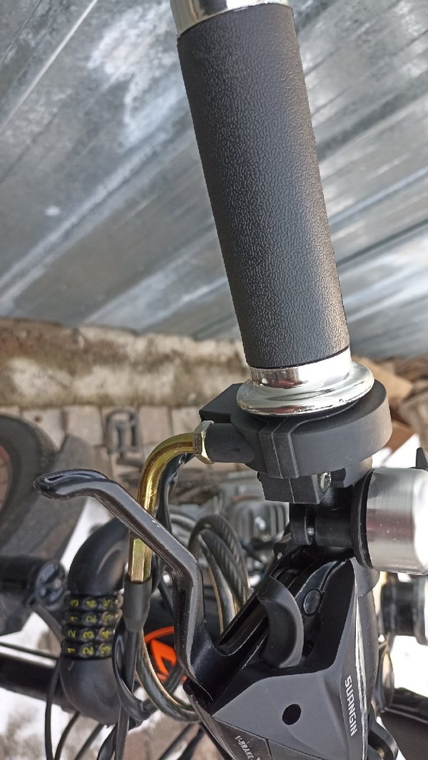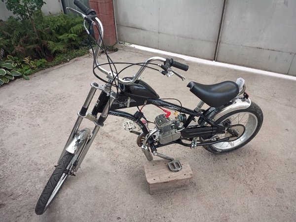 Велосипед крайне необычный. Посадка и рогатейший руль. Тросов сцепления и газа едва хватило по длине, пришлось пускать напрямую. Втулка планетарная так что здесь необычно аж три тормоза. Натяжитель пришлось ставить на длинные болты из-за толстенной рамы.