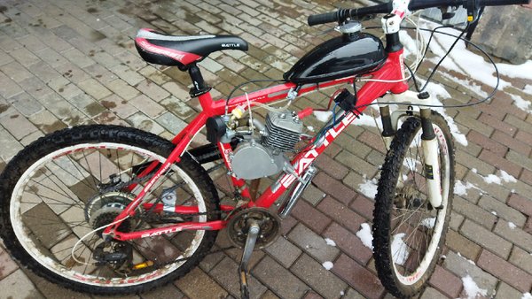 Велосипед и комплект клиент привез сам на установку. Куплен у некоего Стаса (Станислава). Что сказать… Упаковка словно в футбол играли, кооперативный размер 37*42*17 (фабричные А80 в коробках 42*42*17). Инструкцией даже не пахнет. Свечное отверстие сорвано, пришлось разбирать и прогонять резьбу. Цепь очень не понравилась: тонкая, большие люфты в звеньях. После сборки выяснилось что не заводится по причине мёртвого магнето (это новый комплект). Удивил покрашенный глушитель. После замены на исправное магнето двигатель жутко вибрируя (балансиров… — Читать дальше